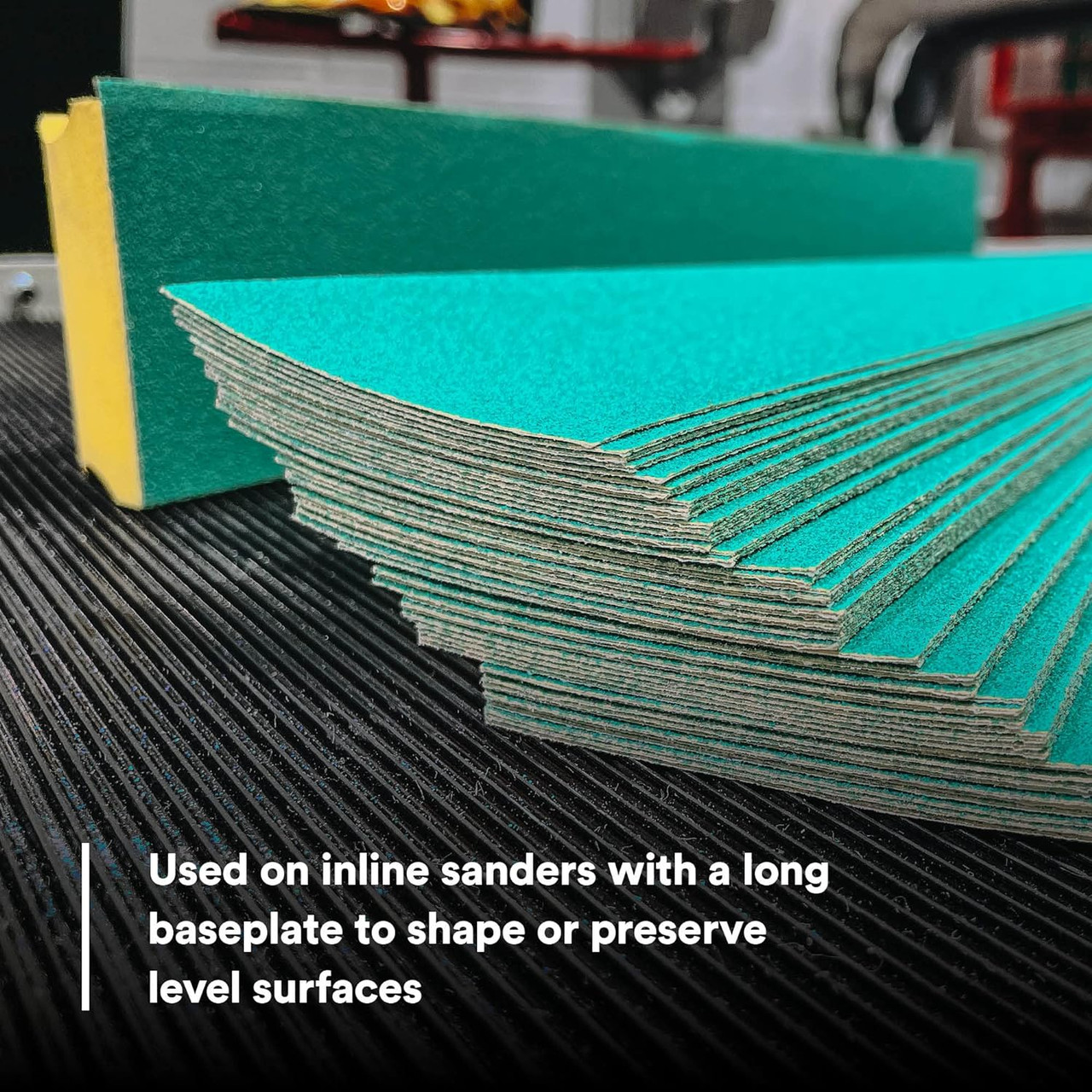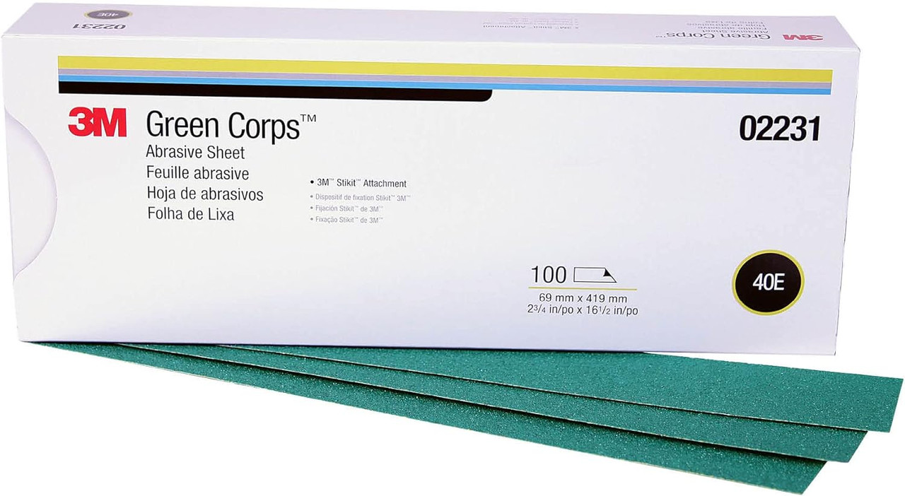 The 3M 2-3/4″ X 16-1/2″ 40E Green Corps Stikit Production Sheet (2231) is a high-performance abrasive sheet designed for demanding automotive applications. It utilizes a ceramic aluminum oxide mineral blend to provide a fast and efficient cut rate, making it ideal for tasks such as paint removal, sanding, and shaping fillers.